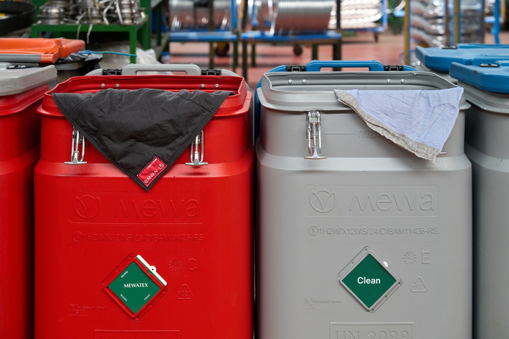 Os profissionais panos de limpeza industriais estão sempre à mão, a partir do momento em que o sistema da Mewa estiver instalado, e isso acontece de forma simples com a primeira entrega. Assim começa o ciclo de poupança de recursos: A Mewa recolhe o SaCon com os panos usados para lavagem, submete-os a um controlo de qualidade em várias etapas e entrega-os de novo, diretamente na linha de produção. Isto significa que, com a Mewa como parceira, toda a logística dos panos é passado. A Mewa trata de tudo. Outra vantagem é que os panos lavados ocupam pouco espaço, uma vez que também ficam no SaCon. Para uma rápida diferenciação, uma placa na parte externa do contentor informa se contém panos novos ou usados.